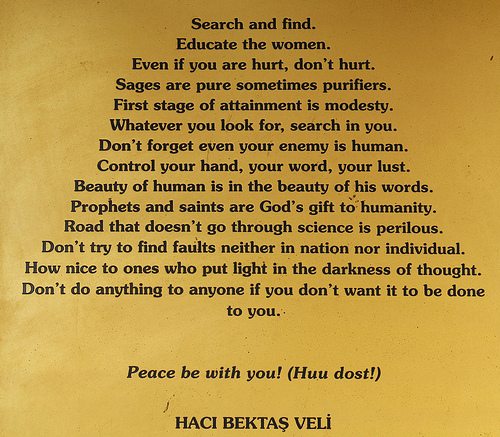 Hacı Bektaş Veli werd in de 13e eeuw geboren in Nishapur, Iran. Hij reisde tijdens zijn leven door heel Anatolië en woonde o.a. in Kayseri, Sivas en Kırşehir, voordat hij zich uiteindelijk in Hacıbektaş vestigde. Zijn leer wordt gekenmerkt door een humanistische kijk op mens en wereld.