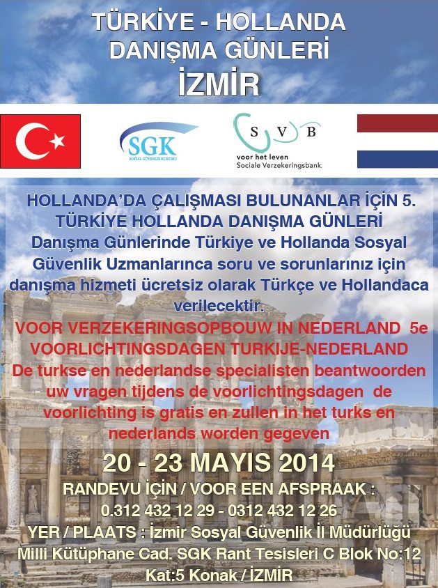 Alle Nederlanders in Izmir en omstreken opgelet: van dinsdag 20 t/m vrijdag 23 mei 2014 organiseert de SVB in samenwerking met het SGK voorlichtingsdagen in Izmir.