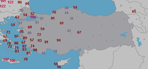 2. Hier gaat ’t ook redelijk heftig (in Eskisehir) maar de heuvels blokkeren vermoedelijk de meeste wind. Ik vermoed dat ’t langs de kust ’t ergste is.