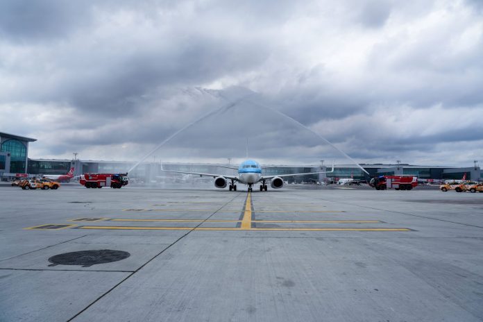 Brandweerwagens op de nieuwe Turkse luchthaven in Istanbul stonden klaar en maakten een tunnel van waterstralen toen een KLM toestel arriveerde.