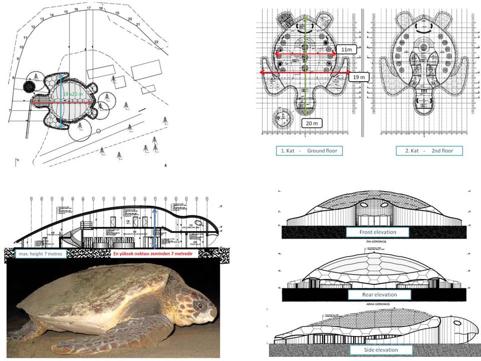 Ook de aard van de bebouwing zoals toegelicht door Prof. Kaska is reden tot verontwaardiging. Het nieuwe centrum in de vorm van een zeeschildpad zal een oppervlakte van 20×19 meter beslaan en wordt 7,5 meter hoog. Hoewel de professor volhoudt dat het geen permanente bebouwing is maar een prefab constructie van RVS die beplaat wordt, zijn tegenstanders ervan overtuigd dat hier een betonnen fundering nodig is en het dus wel degelijk een permanente bebouwing is. De meesten verafschuwen de gedachte van een Disney-achtig gevaarte van deze hoogte op een natuurlijk beschermd strand als İztuzu. Zelfs in Dalyan zelf zou de bouw van zo’n gebouw wettelijk verboden zijn. dekamer drafts